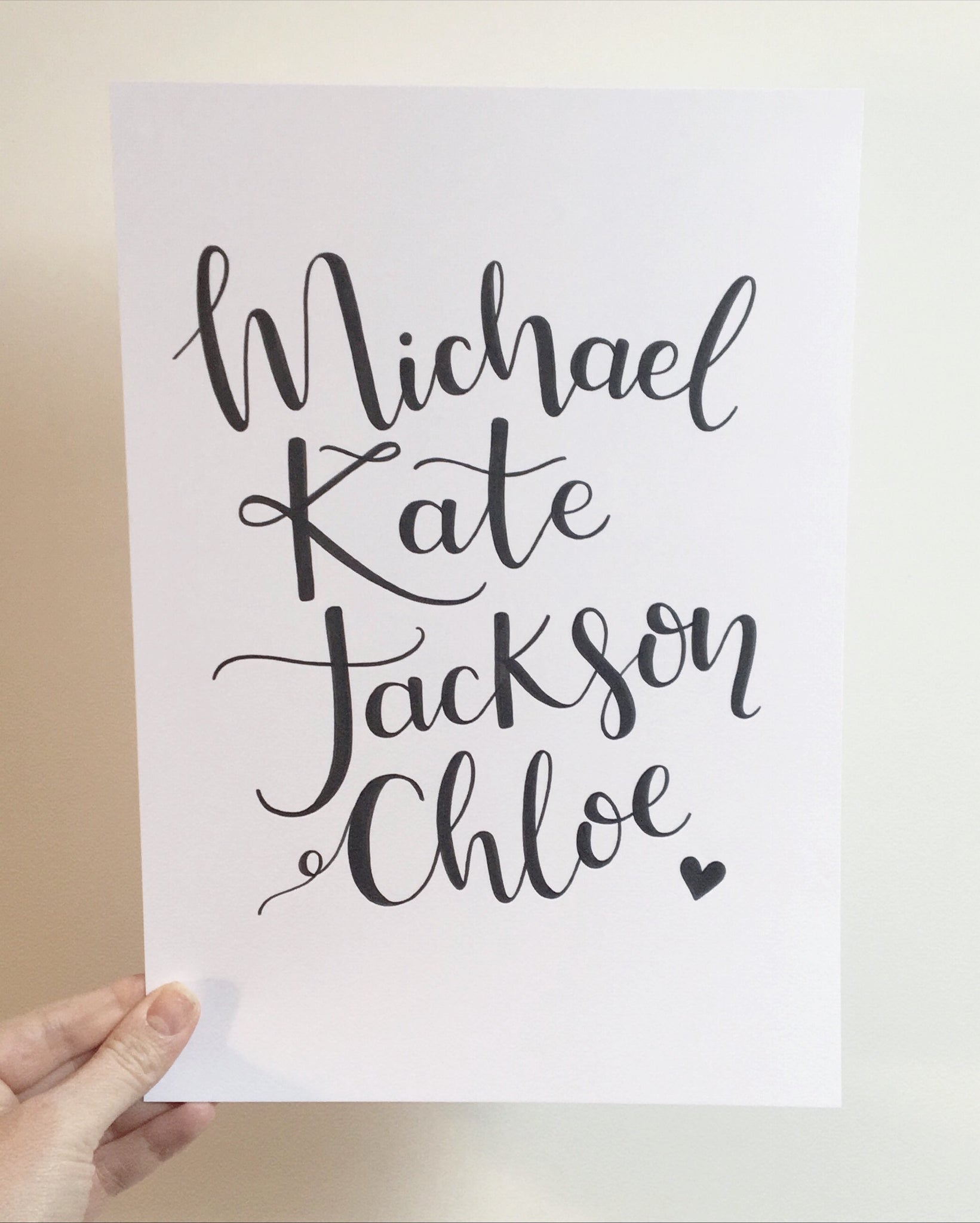 Personalised family wall art in black lettering. Up to 6 names (including pets) on A4 white card. Finished with signature black heart.