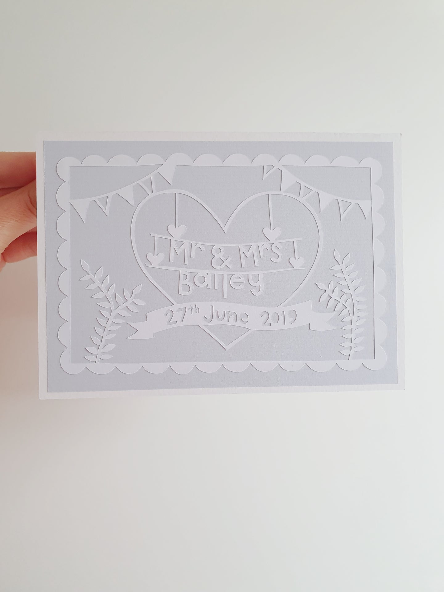 Hand drawn and hand cut personalised wedding card. Heart & bunting design with name and wedding date.