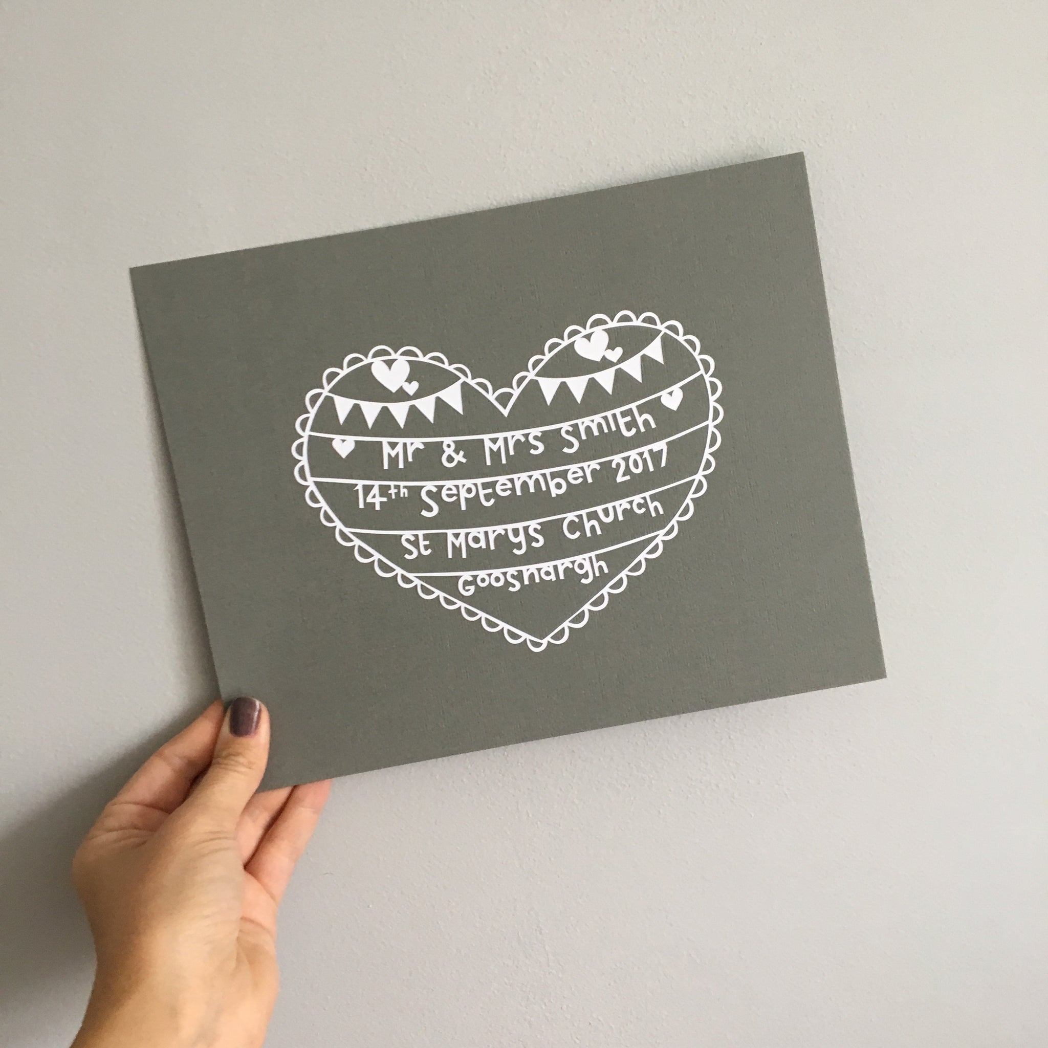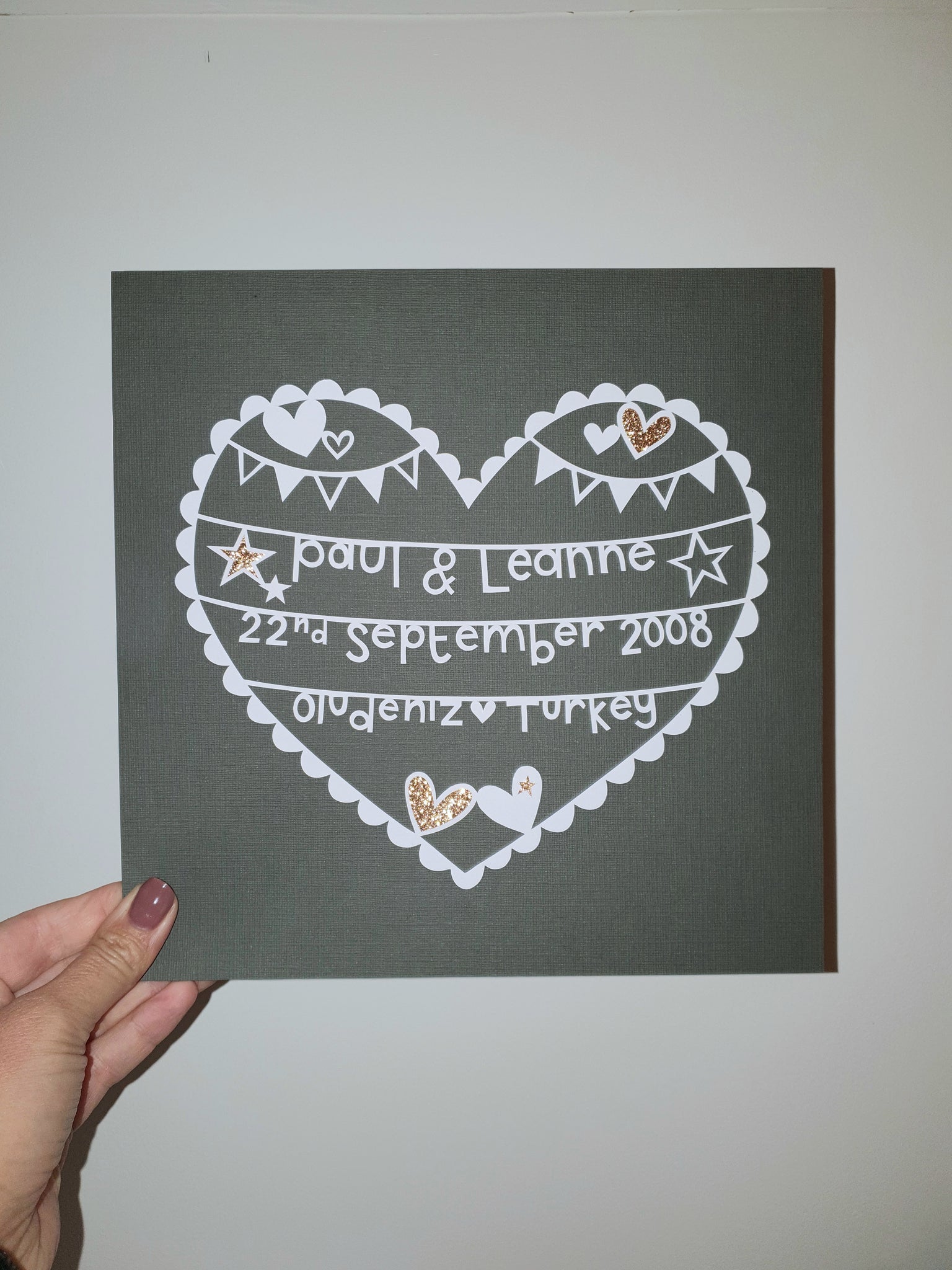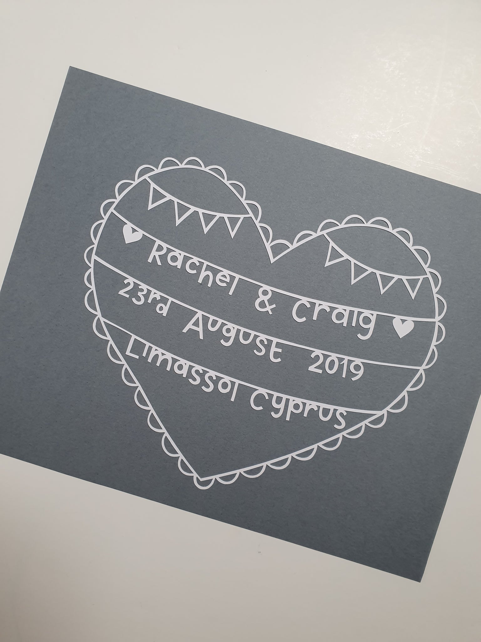 Personalised wedding papercut with Names, wedding date and location on. Heart shaped finished with pretty lace edging.